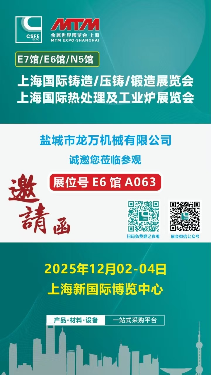 ইয়ানচেং লংওয়ান মেশিনারি কোং লিমিটেড “সাংহাই ইন্টারন্যাশনাল স্টিল/ডাই কাস্টিং/ফাউন্ড্রি প্রদর্শনী” এবং সাংহাই ইন্টারন্যাশনাল হিট ট্রিটমেন্ট অ্যান্ড ইন্ডাস্ট্রিয়াল ফার্নেস এক্সিবিশনে অংশ নেবে ২রা ডিসেম্বর থেকে ৪ঠা ডিসেম্বর, ২০২৫ পর্যন্ত সাংহাই ইন্টারন্যাশনাল এক্সপো সেন্টারে। শিল্প ইয়ানচেং লংওয়ান মেশিনারি কোং, লিমিটেড এই প্ল্যাটফর্মটি ব্যবহার করবে যন্ত্রপাতি উৎপাদন ক্ষেত্রে তার সর্বশেষ প্রযুক্তি এবং উদ্ভাবনী পণ্যগুলি প্রদর্শন করতে।